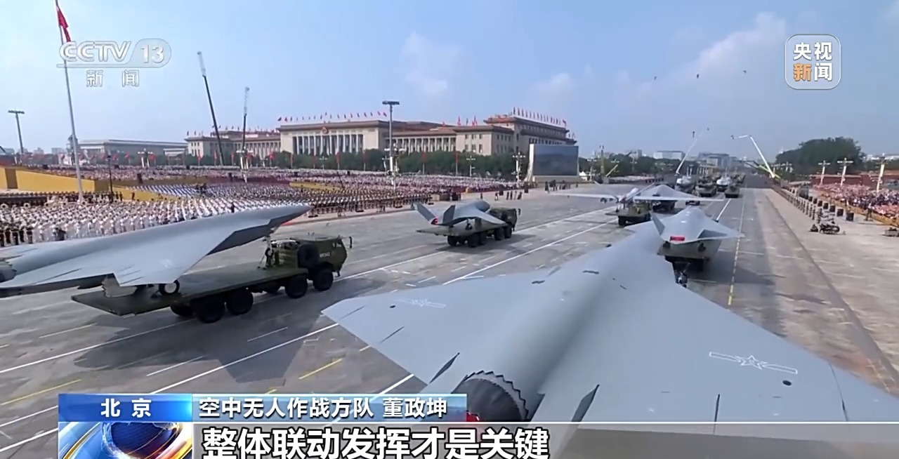 在阅兵式中空中无人作战方队预警,装备卡距都是超宽超限不小的考验。