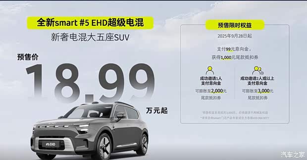 smart精灵#5 EHD插混版已于此前开启预售,轴距为2800mm。